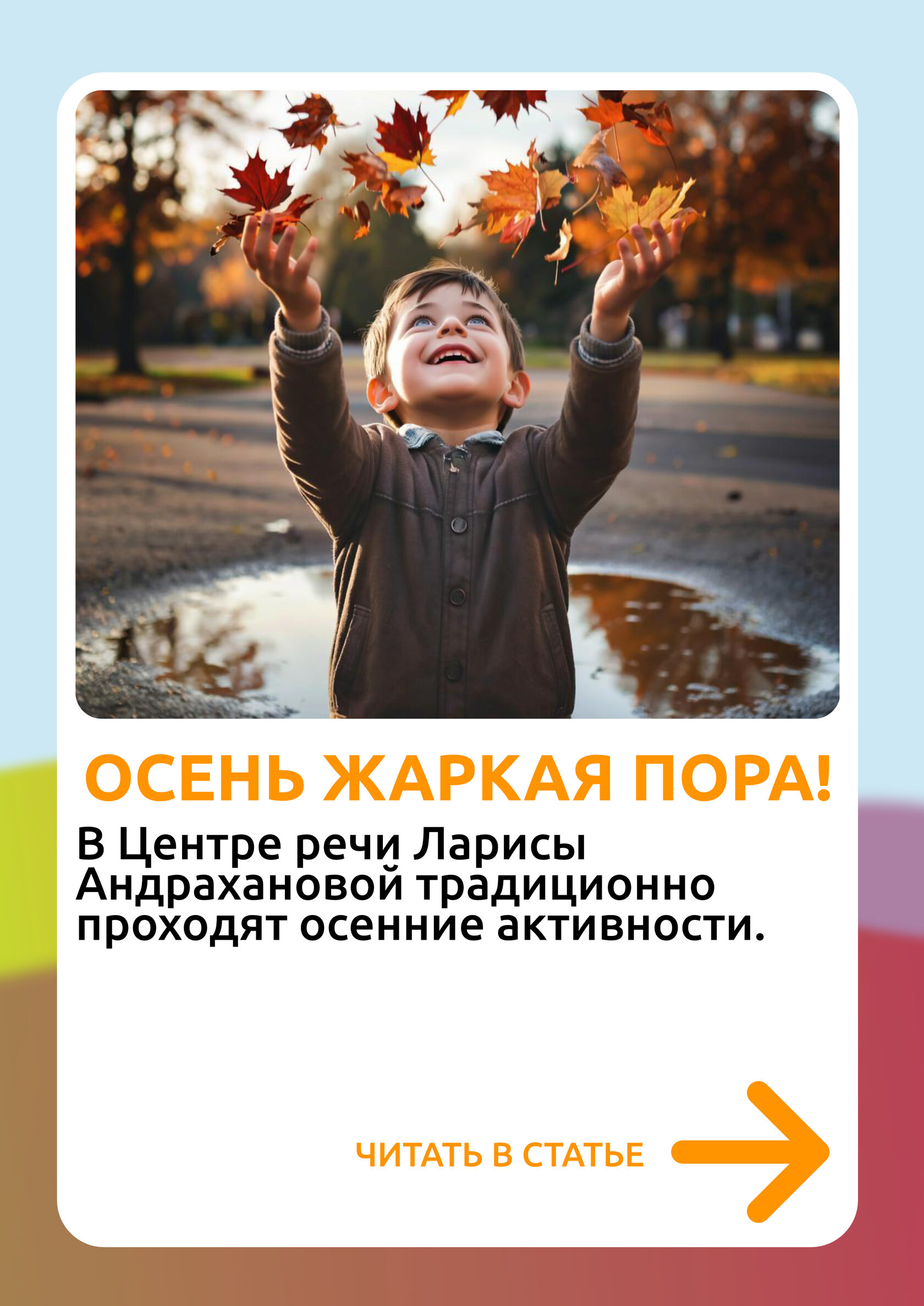 Осенняя пора в Центре речи Ларисы Андрахановой проходит насыщенно и интересно. В этом году для родителей организованы ребусы — они помогают развивать логическое мышление и внимание. Для детей подготовлено творческое задание: украшение платья девочки "Осень" листочками, что способствует развитию мелкой моторики, воображения и ориентированности в природе.